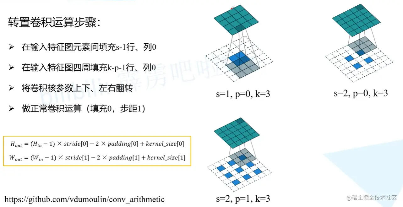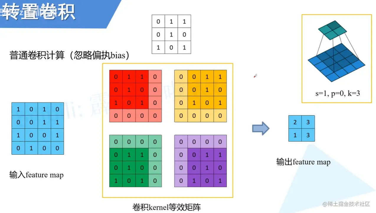 把卷积核矩阵转置乘原图矩阵就是转置卷积,因此卷积运算的反向传播就是通过转置卷积实现的。以及转置卷积在生成任务中如果卷积核大小为3,步长为2,会有非常明显的棋盘效应,因此更推荐使用最临近插值或双线性插值后再接一个卷积来取代转置卷积。