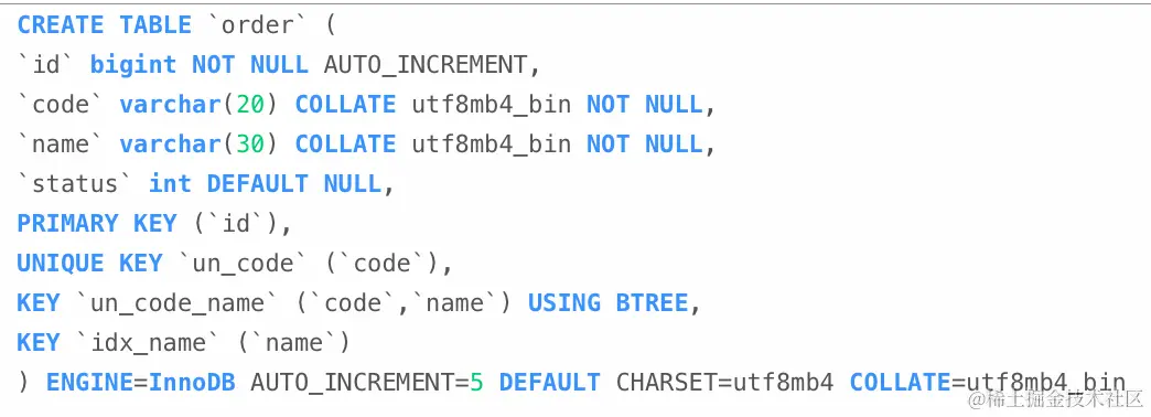 我们能够看到非常完整的建表语句,表名、字段名、字段类型、字段长度、字符集、主键、索引、执行引擎等都能看到。