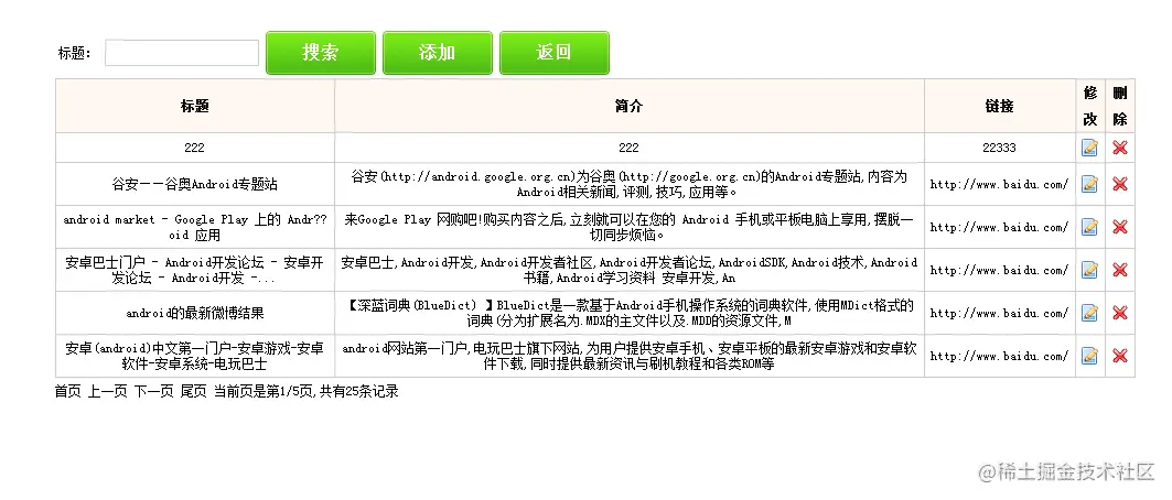 管理员可以点击页面的“登录”链接到管理员登录页面,用户在登录页面输入账号和密码即可登录系统,登录后用户可以看到目前系统所有数据,同时也可以修改或者删除任何一条数据可以通过标题来搜索自己想看的数据,也可以通过添加按钮来添加新的数据: