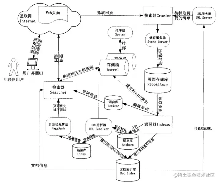 由上图可知,搜索引擎程序可以化分为搜索器子程序、索引器子程序、检索器子程序以及用户接口子程序等模块;存储器以及存储桶是用来存储所检索到的各种资源的。
