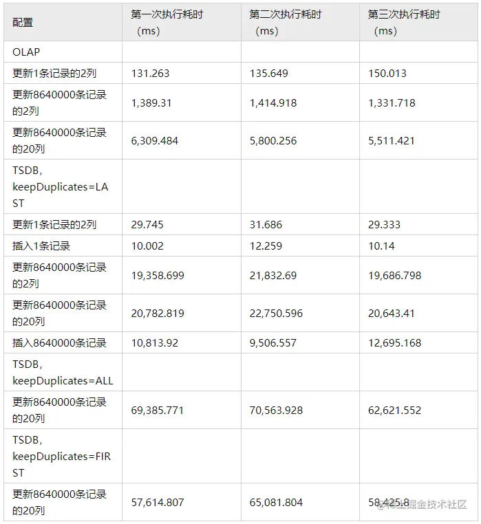 OLAP 存储引擎的更新性能与需要更新的列数和操作系统是否支持硬链接有关。TSDB 存储引擎的更新性能与建表参数 keepDuplicates 有关,建表参数 keepDuplicates=LAST 比 TSDB keepDuplicates=ALL 或 FIRST 时更新性能更好。