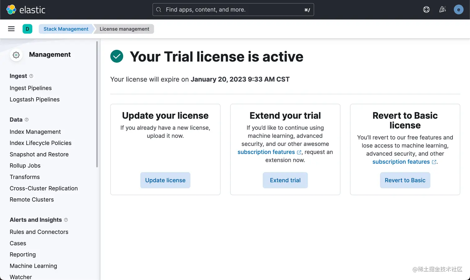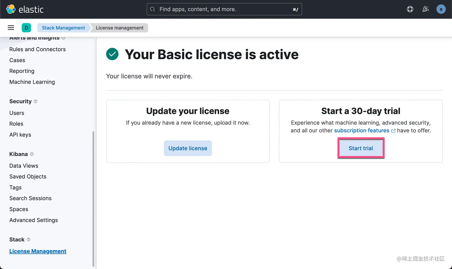 请注意文章中的 8.x 的安装部分。由于使用 eland 上传模型是白金版或者是企业版的功能,在我们的演示中,我们需要启动白金版试用功能: