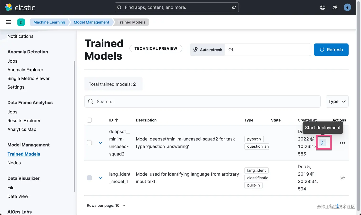 部署后,State 列的值为 started,Actions 下的 Start deployment 选项将被禁用,这意味着部署已经完。