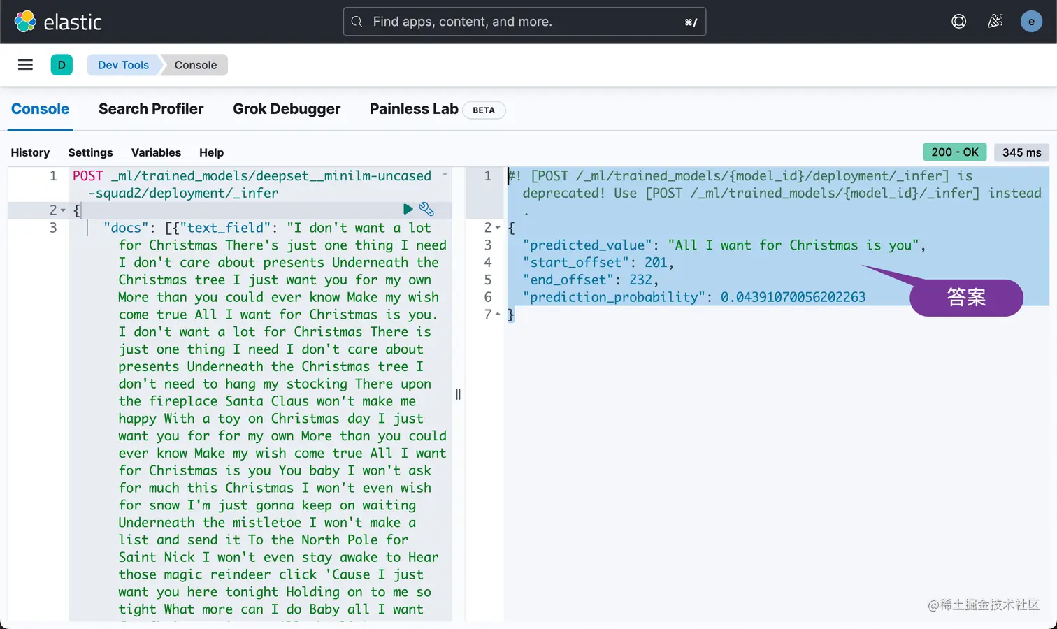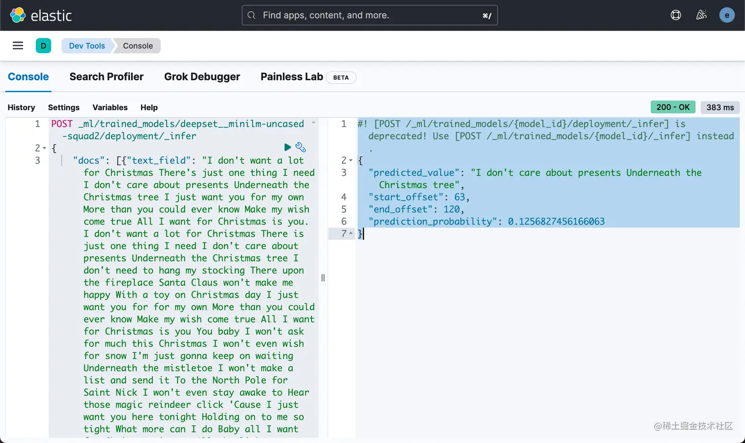 此 POST 方法包含一个文档数组,其中包含一个与你配置的训练模型输入匹配的字段,通常字段名称为 text_field。 text_field 值是你要推断的输入。 对于提到的 QA 模型,除了我们将提供的文本作为输入外,问题是必需的,inference_config 包含推理的配置,对于 QA 模型,针对你的 text_field 提出问题。