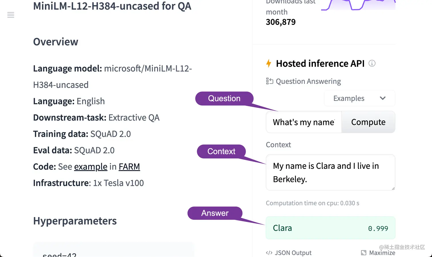 在此演示中,我们将使用随机 QA 模型,但你可以随意导入要使用的模型。 你可以在 Hugging Face 网页上阅读有关此模型的更多详细信息。