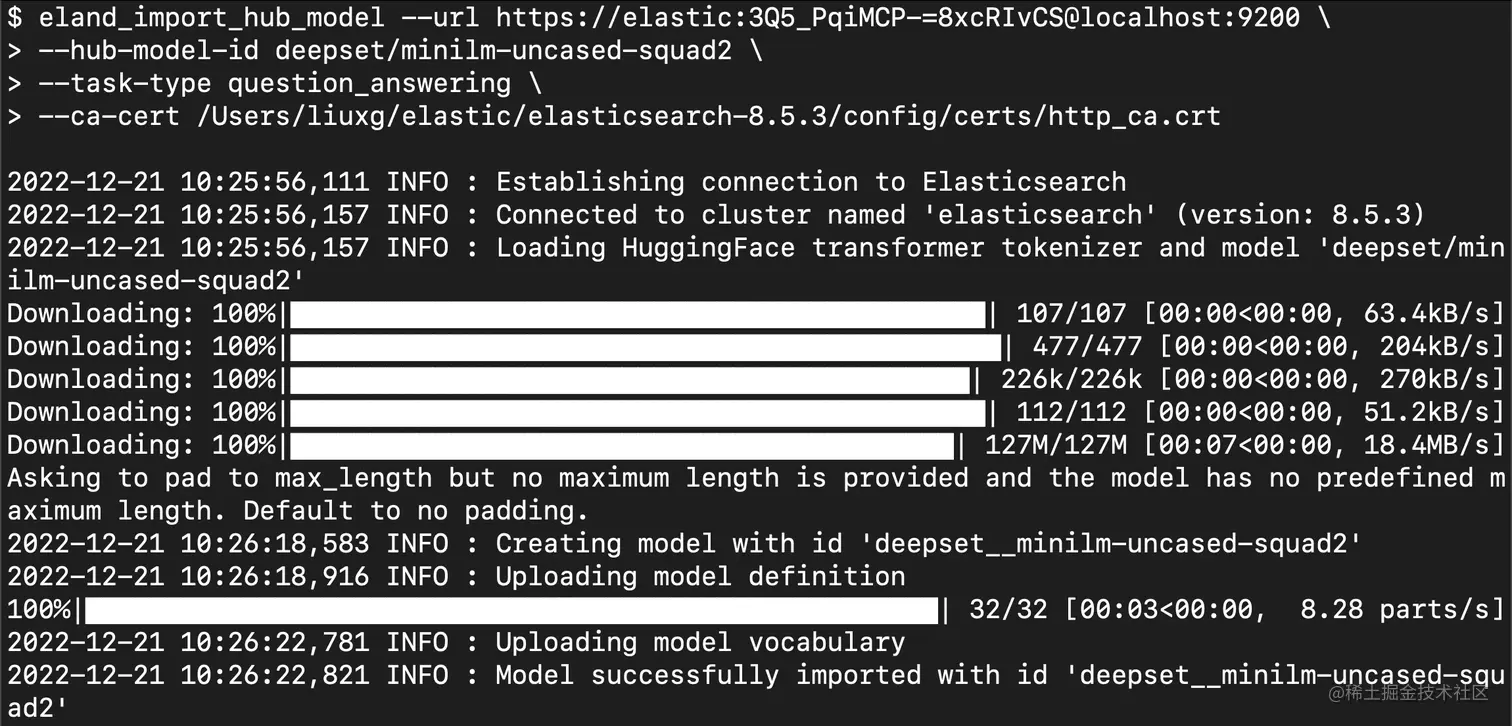 1. eland_import_hub_model --url https://elastic:3Q5_PqiMCP-=8xcRIvCS@localhost:9200 \