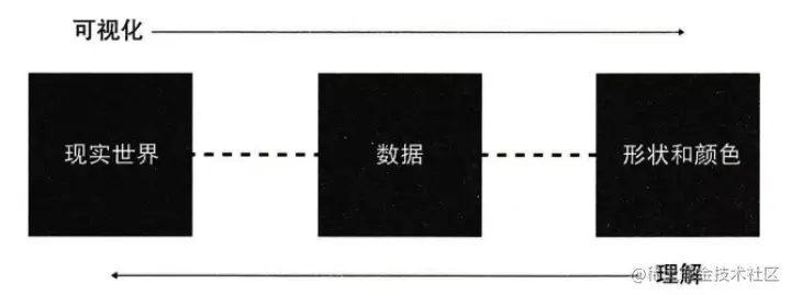 引用《数据之美》中的一张图如下所示,可视化将现实世界的数据转换为图表的形状和颜色,我们再通过图表的形状和颜色来理解现实世界。