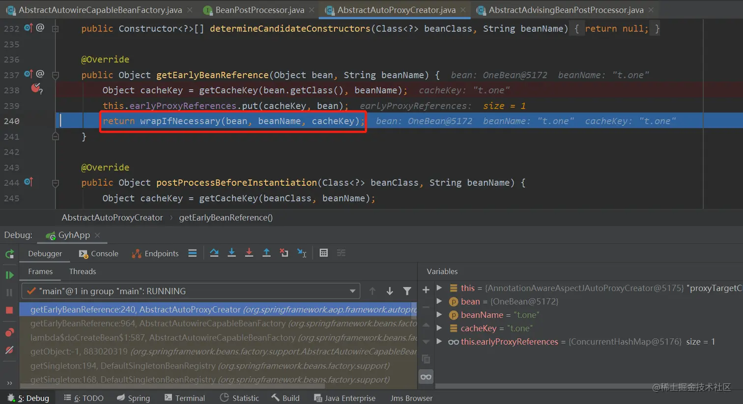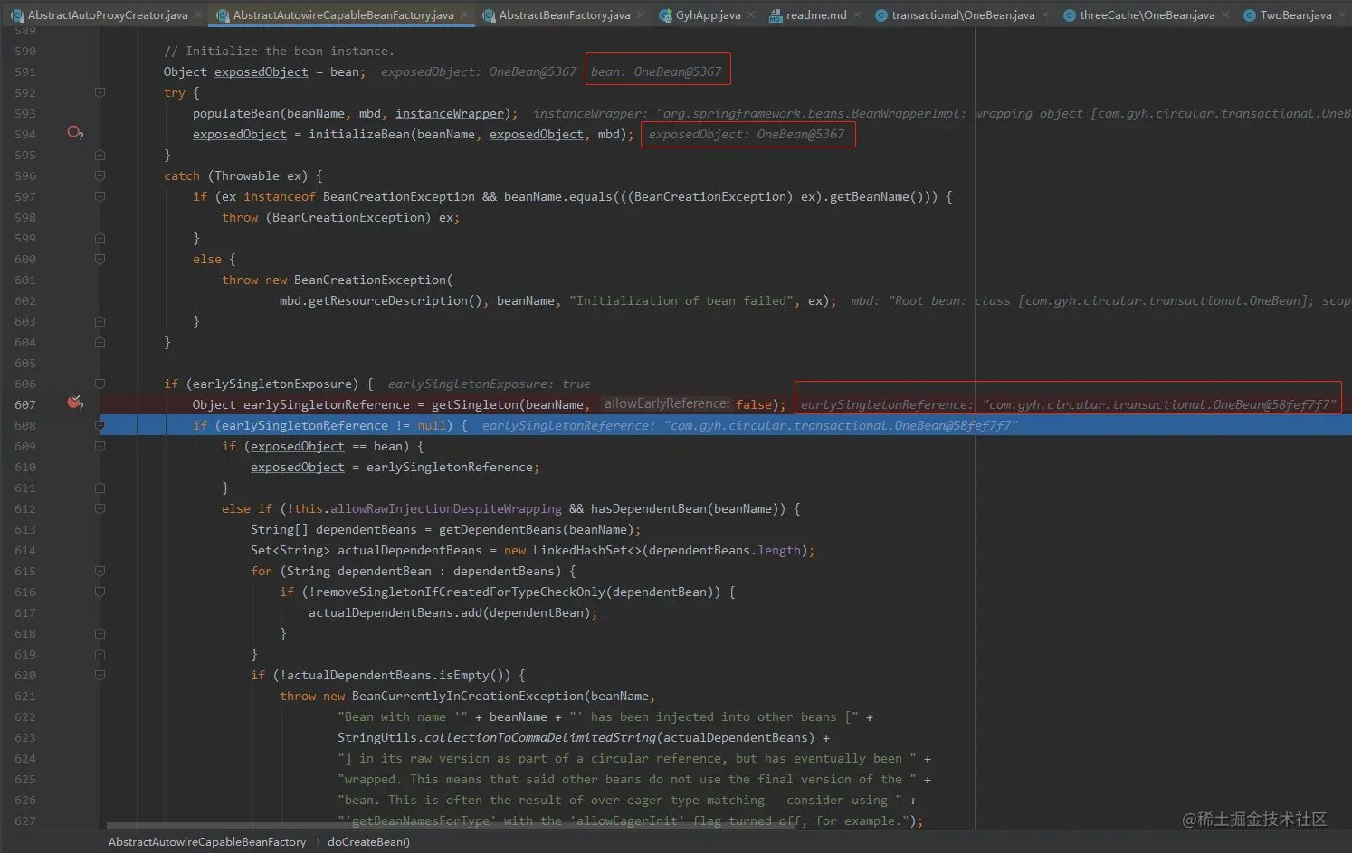 debug 代码可知,生成 OneBean 过程中,虽然 earlySingletonReference != null,但 initializeBean 之后的 exposedObject 和 原始实例的地址相同(即 initializeBean 步骤中,并未对实例生成代理),所以不会产生报错。
