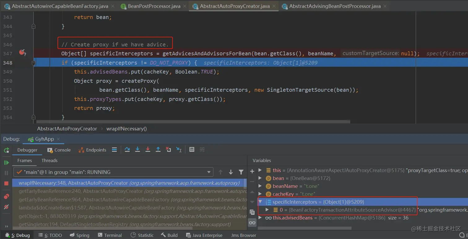 使用 @Transactional 的Bean 在 create proxy 时,获取到一个advice ,随即生成了代理对象 proxy.