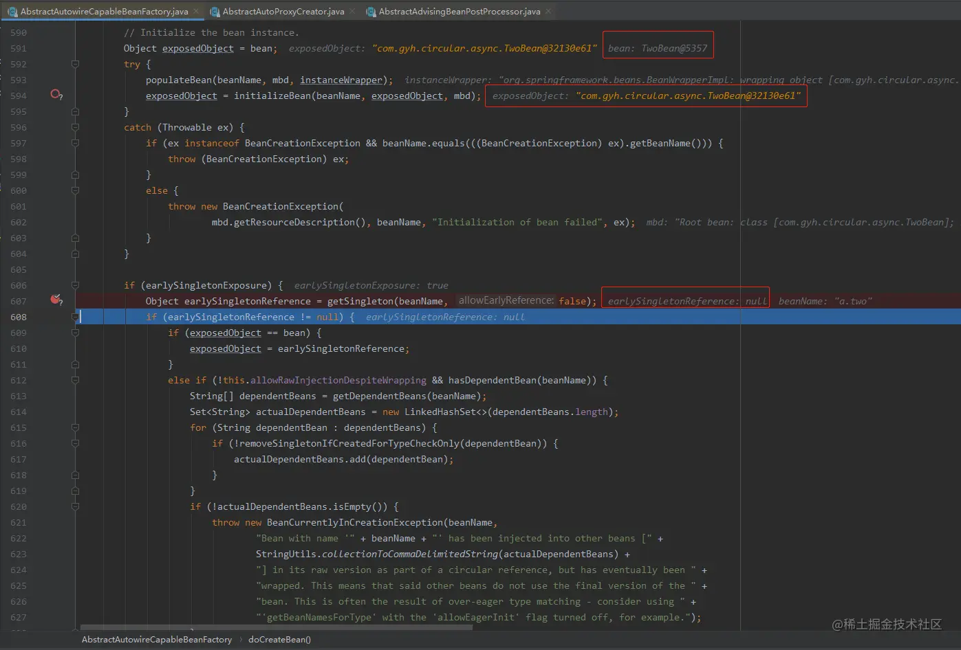 debug代码可知:虽然TwoBean 使用了 @Async 注解,但其 earlySingletonReference = null; 故不会引起报错。
