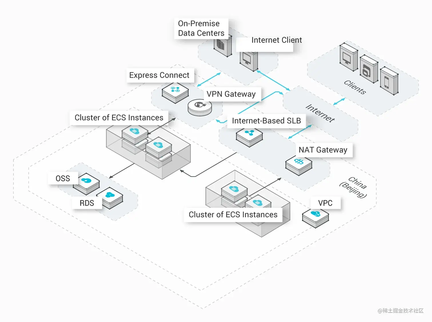 业务系统同时存在于本地机房和云上机房,基于阿里云VPC搭建不同的业务模块,构建完全隔离的云上环境,云上云下通过公网进行业务交互