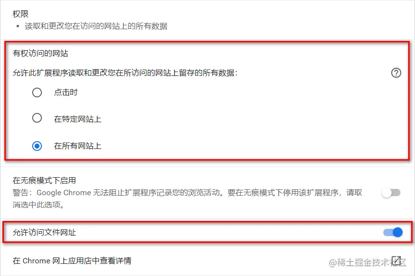 点击 Chrome 浏览器右上角的 按钮,选择更多工具 -> 扩展程序 -> Vue.js devtools 详细信息,并勾选如下的两个选项: