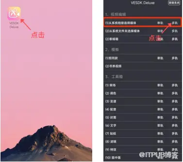 在手机屏幕上点击“VESDK Deluxe”图标,打开VESDK Deluxe APP。进入“VESDK Deluxe”APP的主界面,点击“从系统相册选择媒体”多轨按钮,如图所示。