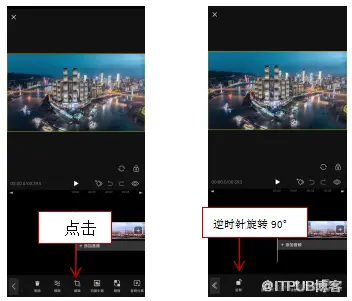 1. 在VESDK Deluxe APP中导入一段视频素材,选中轨道视频,点击“编辑”按钮,点击“旋转”按钮,对素材进行逆时针旋转90°处理。如图所示。