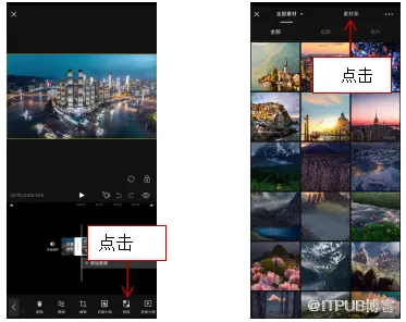 2. 进入“素材选择界面”可以选中相册中的素材,也可以点击“素材库”选项卡进行替换素材,素材时长可以选择比被替换素材时长长的素材。也可以选择与被替换素材时长相同的素材。