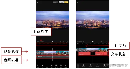 在时间线区域中,有一根白色的垂直线条叫时间轴,上面为时间刻度。我们可以在时间线上任意滑动来预览导入的视频效果。在时间线上可以看到视频轨道和音频轨道,还可以增