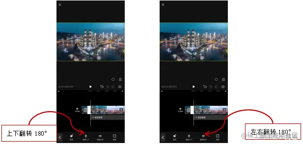 2. 点击“镜像上下”按钮,对素材进行上下翻转处理。点击“镜像左右”按钮。对素材进行左右翻转处理。如图所示。