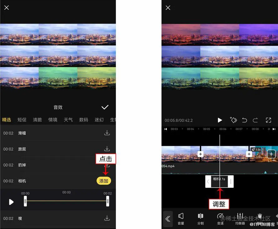 5. 点击“﹤”按钮,返回一级工具栏,依次点击“音频”按钮和“音效”按钮,在“精选”选项卡中选择“相机”音效,即可添加一个拍照音效,如图所示。