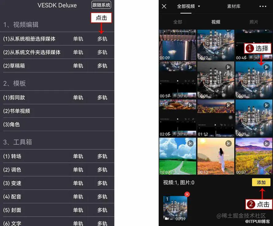 1. 在VESDK Deluxe APP中导入一段视频素材,添加背景音乐,如图所示。