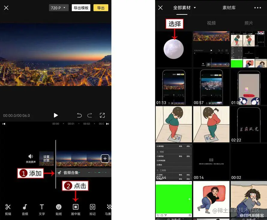 2. 提前准备一张黑底月亮素材,在“全部素材”界面中选择月亮素材进行导入,如图所示。