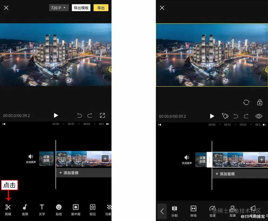 1. 在VESDK Deluxe APP中导入一段视频素材,添加背景音乐,点击下方一级工具栏中的“剪辑”按钮,如图所示。