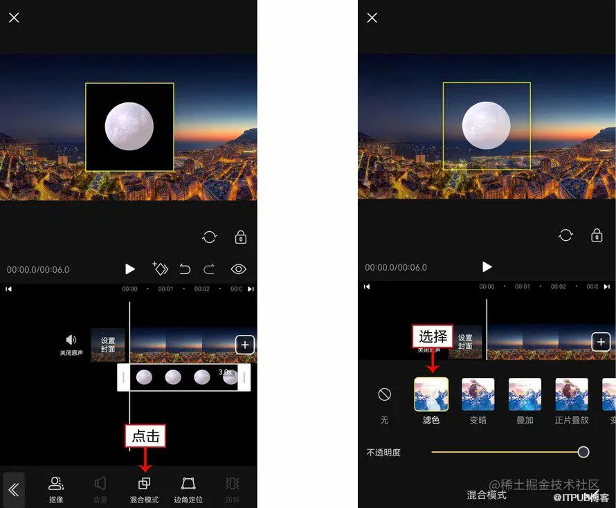 3. 素材导入后,点击下方“混合模式”按钮,如图所示。