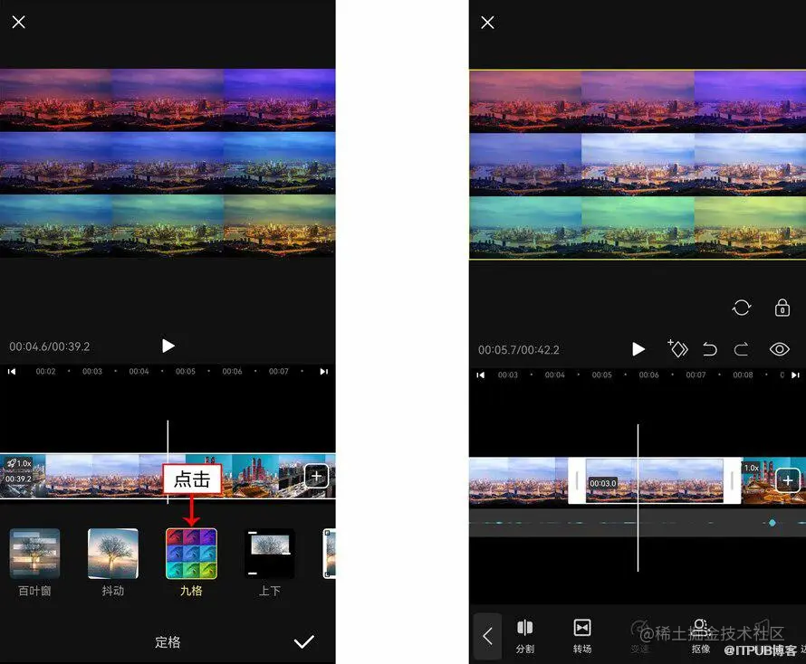 “定格”功能能够将视频中的某一帧画面冻结并持续若干秒,再给定格画面一个特效,画面就像被照相机拍成了照片一样定格了,接着画面又继续动起来。