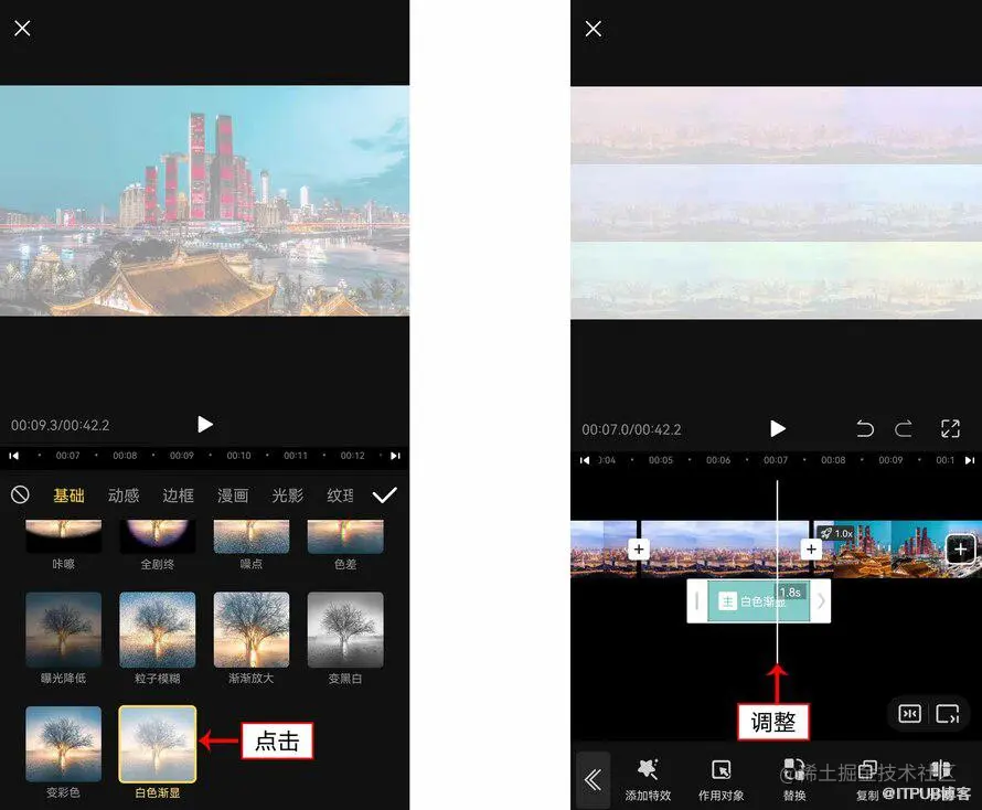 7. 返回主界面,依次点击“特效”按钮和“画面特效”按钮,进入相应界面后,在“基础”特效选项卡中选择“白色渐显”特效,如图所示。