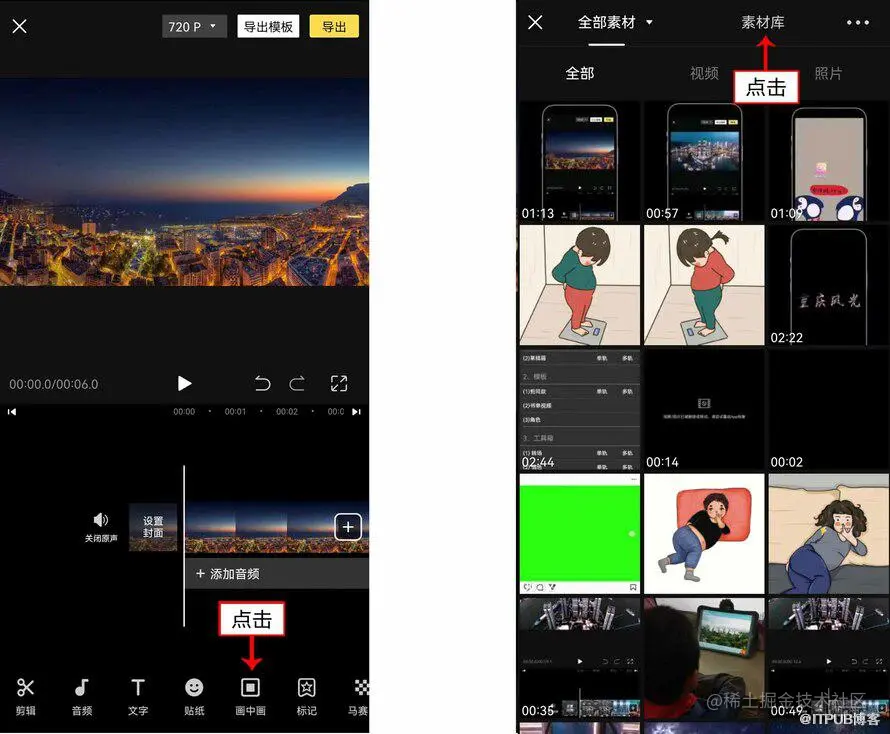 1. 在VESDK Deluxe APP中导入一段视频素材,点击下方“画中画”按钮,如图所示。