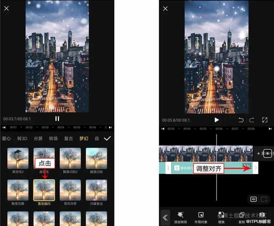 6. 调整“雪花细闪”特效时长与主视频一致,如图所示。