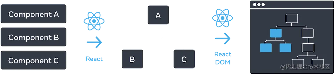 在渲染完成并且 React 更新 DOM 之后,浏览器就会重新渲染屏幕