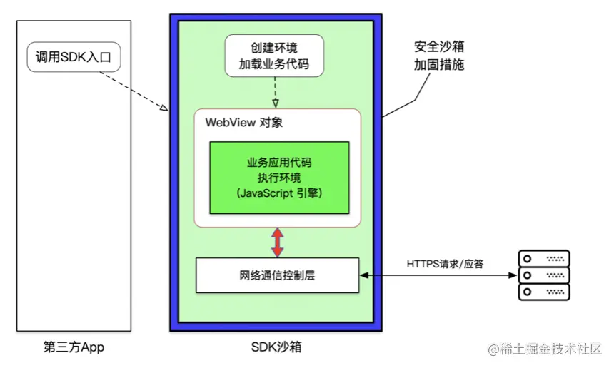 SDK 为业务代码提供一个封闭的安全沙箱,有效对抗外部代码的干扰和数据 泄露风险;第三方App只能通过SDK暴露的接口启动SDK, SDK完全管控对业务 代码所需要的运行环境以及业务代码所有对外通信,可以通过多种机制保证网络 通信不被拦截和干扰;SDK 内部使用独立的浏览器内核,运行环境与系统浏览器 完全隔离 (在 Android 上)。
