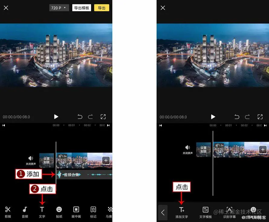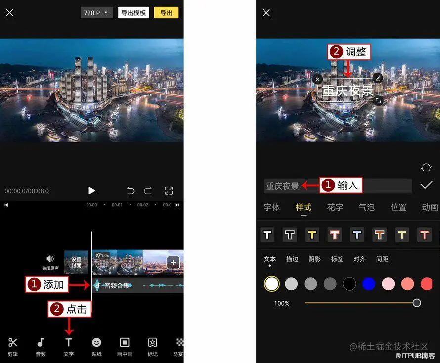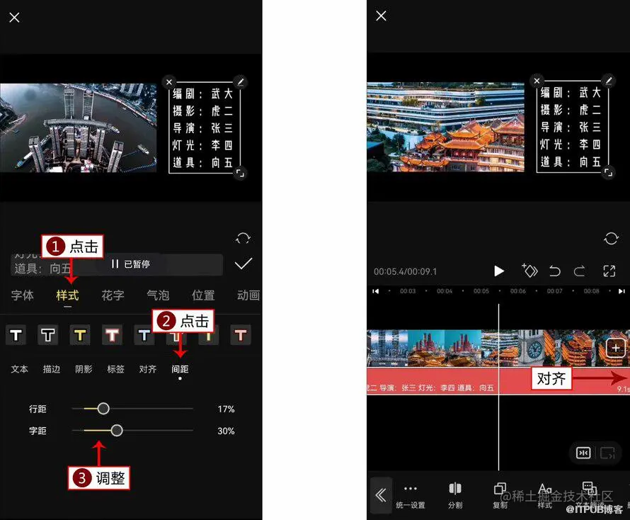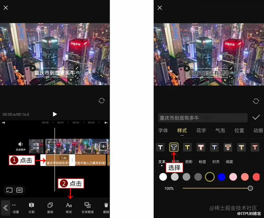 1. 在VESDK Deluxe APP中导入一段带有城市建筑物的视频素材,添加文字并设置相应的文字样式效果,如图所示。