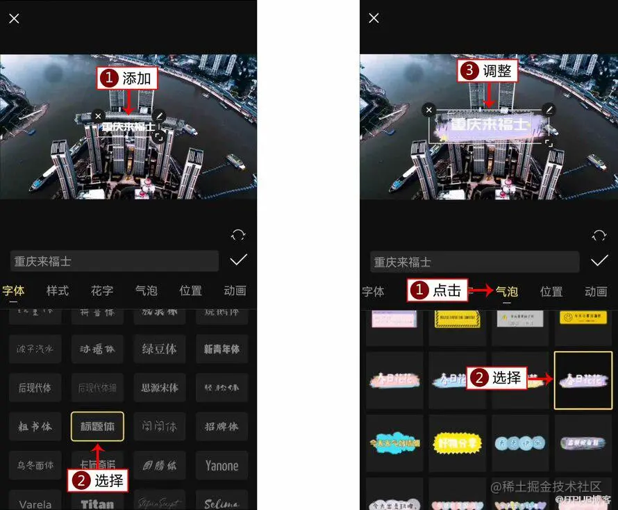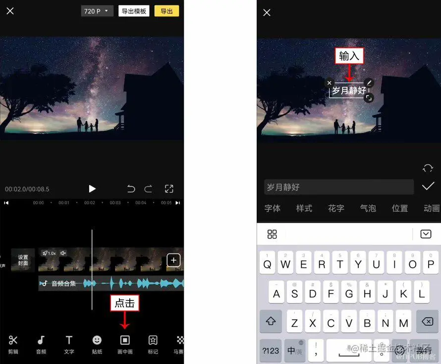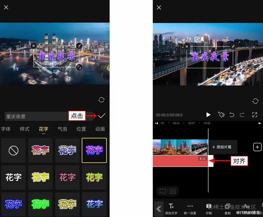 使用“花字”功能可以快速做出各种花样的字幕效果,让视频中的文字更有表现力。