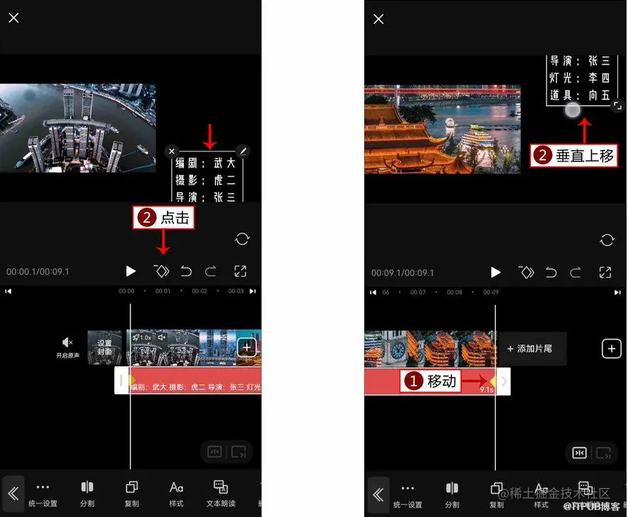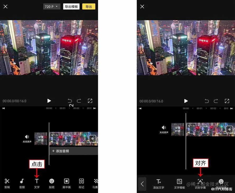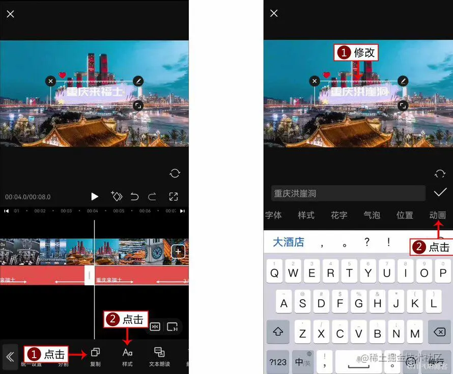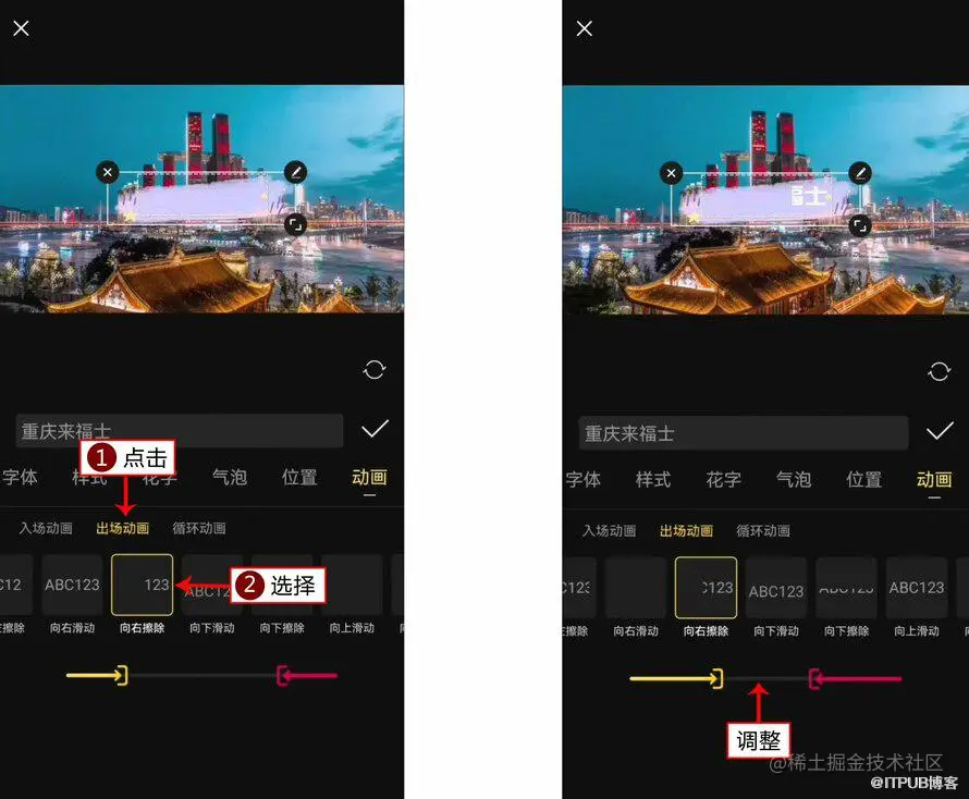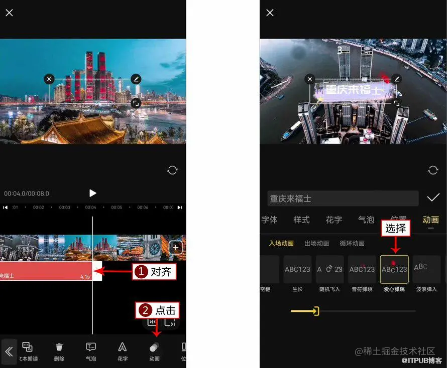 3. 文字样式制作好后将文字轨道时长拉至第一个建筑物消失处,点击下方“动画”按钮,如图所示。