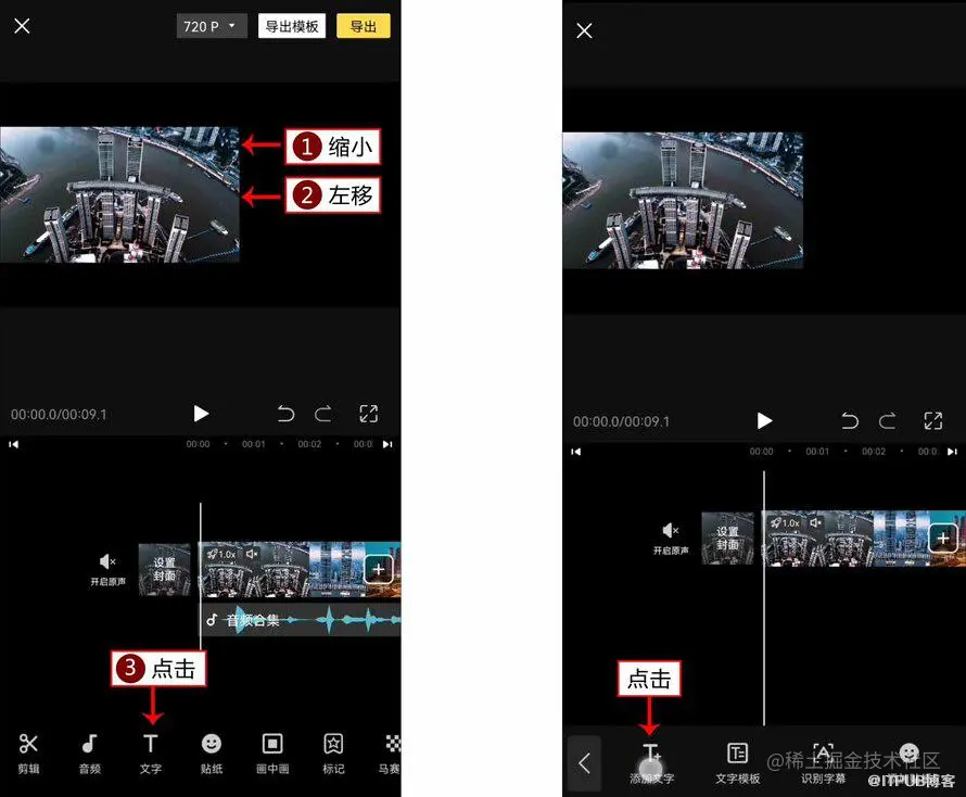 1. 在VESDK Deluxe APP中导入一段视频素材,在预览区域将画面缩小放置于左侧,点击下方“文字”按钮,如图所示。