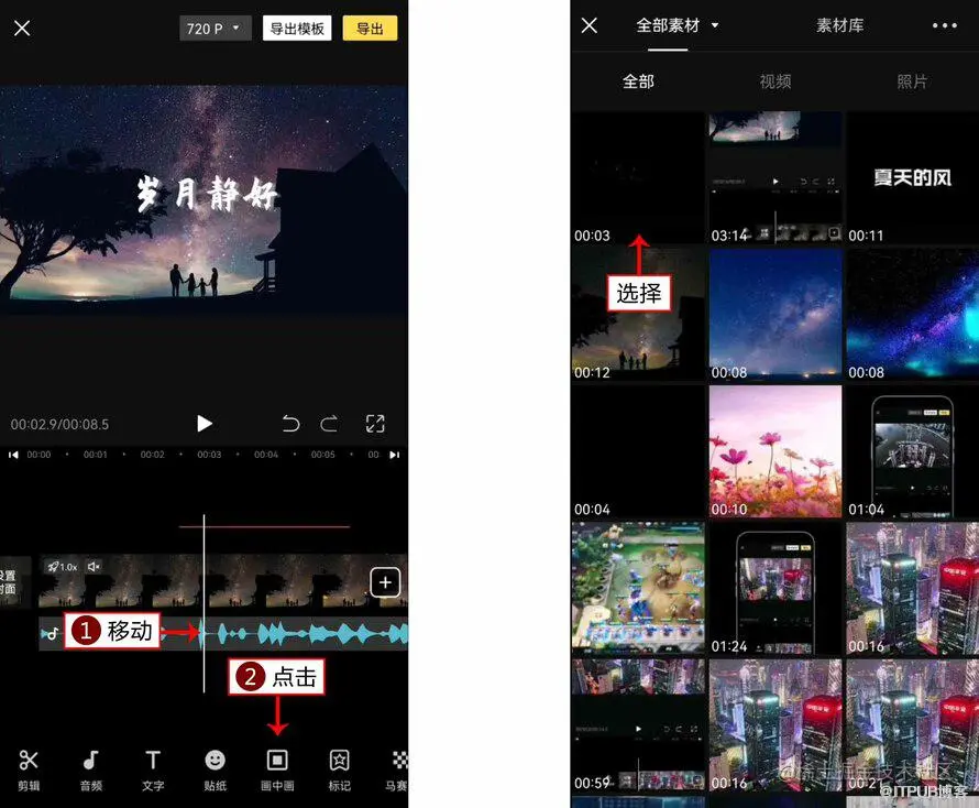 7. 将播放指针移至文字刚好滑下的位置,点击“画中画”按钮新增画中画,如图所示。
