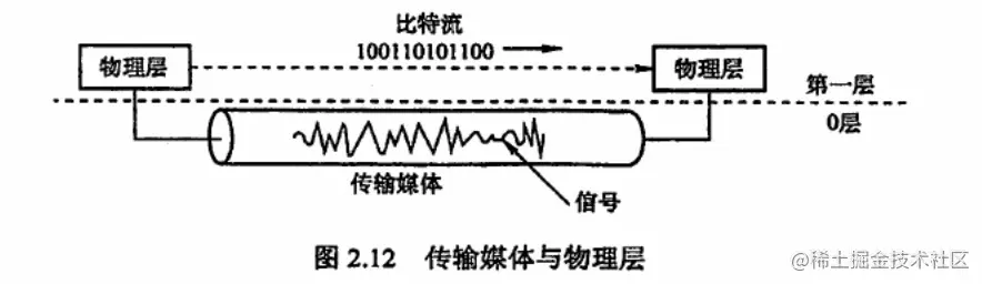 传输媒体并不是物理层。由于传输媒体在物理层的下面,而物理层是体系结构的第一层,因此有时称传输媒体为0层。在传输媒体中传输的是信号,但传输媒体并不知道所传输的信号代表什么。也就是说,传输媒体不知道所传输的信号什么时候是1什么时候是0。但物理层由于规定了电气特性,因此能够识别所传送的比特流。图2.12描述了上述概念。