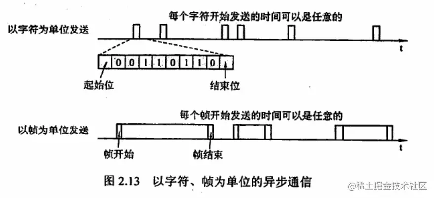 在计算机网络中,同步(Synchronous)的意思很广泛,没有统一的定义。例如,协议的三个要素之一就是“同步”。在网络编程中常提到的“同步”则主要指某函数的执行方式,即函数调用者需等待函数执行完后才能进入下一步。异步(Asynchronous).可简单地理解为“非同步”。 同步通信的通信双方必须先建立同步,即双方的时钟要调整到同一个频率。收发双方不停地发送和接收连续的同步比特流。主要有两种同步方式:一种是全网同步,即用一个非常精确的主时钟对全网所有结点上的时钟进行同步:另一种是准同步,即各结点的时钟之间允许有微小的误差,然后采用其他措施实现同步传输。同步通信数据率较高,但实现的代价也较高。 异步通信在发送字符时,所发送的字符之间的时间间隔可以是任意的,但接收端必须时刻做好接收的准备。发送端可以在任意时刻开始发送字符,因此必须在每个字符开始和结束的地方加上标志,即开始位和停止位,以便使接收端能够正确地将每个字符接收下来。异步通信也可以帧作为发送的单位。这时,帧的首部和尾部必须设有一些特殊的比特组合,使得接收端能够找出一帧的开始(即帧定界)。异步通信的通信设备简单、便宜,但传输效率较低(因为标志的开销所占比例较大)。图213给出了以字符、帧为单位的异步通信示意图。