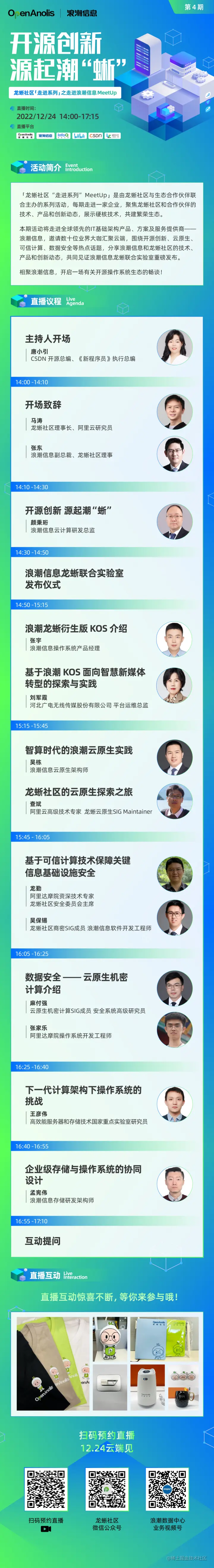 开源创新是龙蜥和浪潮信息共同努力的目标和道路,本期活动将邀请数十位大咖汇聚云端,围绕开源创新、云原生、可信计算、数据安全等热点话题,分享浪潮信息和龙蜥社区的技术、产品和创新动态,共同见证浪潮信息龙蜥联合实验室重磅发布。