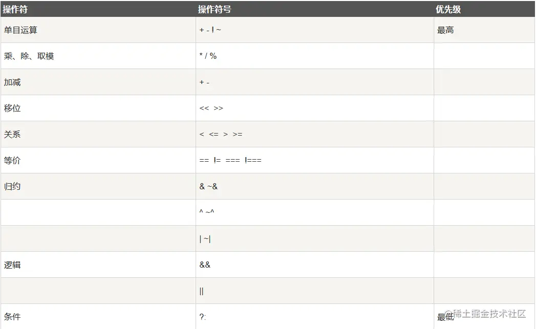 不同操作符之间,优先级是不同的。下表列出了操作符优先级从高至低的排列顺序。当没有圆括号时,Verilog 会根据操作符优先级对表达式进行计算。为了避免由操作符优先级导致的计算混乱,在不确定优先级时,建议用圆括号将表达式区分开来。