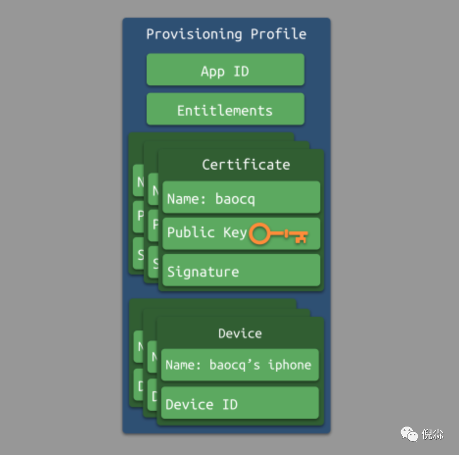 aps-environment production com.apple.developer.associated-domains applinks:xxxx.companyname.com com.apple.security.application-groups group.com.companyname1 2 3 4 5 6 7 8 9 10 11 12 13 14 15 16| ```| ----------------------------------------------- | ---------------------------------------------------------------------------------------------------------------------------------------------------------------------------------------------------------------------------------------------------------------------------------------------------------------------------------------------------------------------------------------------------------------------------------------------------------------------------------------------------------------------------------------- | 事实上,Entitlements 文件的内容并不是全部的授权声明。因为缺省状态下,App 默认会包含与 TeamID 及 App ID 相关的权限声明,如下: | ``` 1 2 3 4 5 6 7 8 9 10 11 12 ``` | ``` <dict> <key>keychain-access-groups</key> <array> <string>xxxxxxxxxx.*</string> </array> <key>get-task-allow</key> <true/> <key>application-identifier</key> <string>xxxxxxxxxx.test.CodeSign</string> <key>com.apple.developer.team-identifier</key> <string>xxxxxxxxxx</string> </dict> ``` | | ----------------------------------- | --------------------------------------------------------------------------------------------------------------------------------------------------------------------------------------------------------------------------------------------------------------------------------------------------------------------------------------------- | 其中 get-task-allow 代表是否允许被调试,它在开发阶段是必需的一项权限,而在进行Archive打包用于上架时会被去掉。 注意:代码签名时,会将Entitlements 文件与上述缺省内容进行合并,得到最终的授权文件,并嵌入二进制代码中,作为被签名内容的一部分,由代码签名保证它的不可篡改性。 **App ID** App ID 即Product ID ,用来标识一个或者一组App。App ID 字符串通常以反域名格式的Company Identifier(Company ID)作为前缀,一般不超过255个ASCII 字符。App ID 全名会被追加 Application Identifier Prefix(一般为 TeamID)。App ID 可以分为两种: - Explicit App ID :唯一的App ID ,用于标识一个应用程序。如:com.apple.garageband 用于标识 Bundle Identifier 为 com.apple.garageband 的 App。 - Wildcard App ID:含有通配符的 App ID,用于标识一组应用程序。如:com.apple.* 用于标识 Bundle Identifier 以 com.apple. 开头(苹果公司)的所有应用程序。 开发者可以在Developer Member Center 网站上注册或者删除已注册的App IDs。在Xcode 中,配置项 Xcode Target -> Info -> Bunlde Identifier 必须与 App ID 是一致的(Explicit)或匹配的(Wildcard)。注册App ID 时,允许开发者在【Capabilities】中勾选所需的权限。与前文提到的授权文件Entitlements 相匹配。  # 设备 设备(Device)即用于开发调试的iOS 设备。每台Apple 设备谁用UDID(Unique Device Identifier)作为唯一标识,也就是设别ID。Apple Member Center 网站个人账号下的Device 中包含注册过的所有可用于开发和测试的设备,普通的个人开发者账号每年累计最多注册100台设备。开发者可在网站上注册或者启用/禁用(Enable/Disable)添加的设备。iOS 中指的是连接到Xcode 被授权用于开发测试的设备(iPhone、iPad)。 描述文件(Provisioning Profile) 创建 描述文件(Provisioning Profile,简称 pp文件)包含了所有内容: - App ID(App ID 在注册时可声明所需沙盒权限,所以包含了 Entitlements) - 证书 - 设备ID  一个Provisioning Profile 对应一个Explicit ID或者 Wildcard ID。在开发者网站上手动创建一个描述文件时,需要确定以上三项内容: (1)App ID:单选(沙盒权限时可多选) (2)证书:可多选,对应多个开发者 (3)设备:可多选,对应多个开发设备 开发者可以下载描述文件,即一个 .mobileprovision 文件。开发者在权限允许的范围内也可以删除描述文件。 Provisioning Profile 会配置到 Xcode -> Target -> Signing & Capabilities -> Provisioning Profile 中。 Provisioning Profile 默认保存在本地的 ~/Library/MobileDevice/Provisioning Profiles 目录下。 构成 .mobileprovision 包含以下这些字段及内容: - Name:即 mobileprovision 文件。 - UUID:即 mobileprivision 文件的真实文件名,是一个唯一标识。 - TeamName:即 Apple ID 账号名。 - TeamIdentifier:即 Team Identity。 - AppIDName:即 explicit/wildcard Apple ID name(ApplicationIdentifierPrefix)。 - ApplicationIdentifierPrefix:即完整 App ID 的前缀。 - ProvisionedDevices:该 .mobileprovision 授权的所有开发设备的 UUID。 - DeveloperCertificates:该 .mobileprovision 允许对应用程序进行签名的所用证书,不同证书对应不同的开发者。如果使用不在这个列表中的证书进行签名,会出现 code signing failed 相关报错。 - Entitlements:包含了一组键值对。<key>、<dict>。 - - keychain-access-groups:$(AppIdentifierPrefix) - application-identifier:带前缀的全名。如:$(AppIdentifierPrefix)com.apple.garageband - com.apple.security.application-groups:App Group ID。 - com.apple.developer.team-identifier:同 Team Identifier。 ## 签名 & 打包 首先,Xcode 会检查 Signing(entitlement、certificate)配置是否与 Provisioning Profile 相匹配,否则编译会报错。  其次,Xcode 会检查 Signing & Capabilities 配置的证书是否在本机 Keychain Access 中存在对应的 Public/Private Key Pair,否则编译会报错。然后,Xcode 证书在本机 Keychain Access 匹配的 Key Pair 的私钥对应用程序 内容(Executable Code,resources such as images and nib files are not signed) 进行签名(CodeSign)。注意:Entitlements 文件也会被嵌入到内容中进行签名。最终,签名、Provisioning Profile、