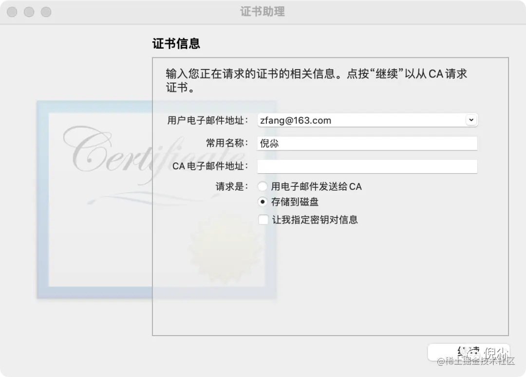 其次,填写用户的身份信息(电子邮箱),并勾选【存储到磁盘】。点击【继续】后将会保存一个CSR (CertificateSigningRequest.certSigningRequest)文件到本地。另外,这个期间会生成一堆非对称密钥对,CeertificateSigningRequest.cerSigningRequest 本质上包含了开发者信息和公钥。私钥则始终保存在开发者的Mac中。