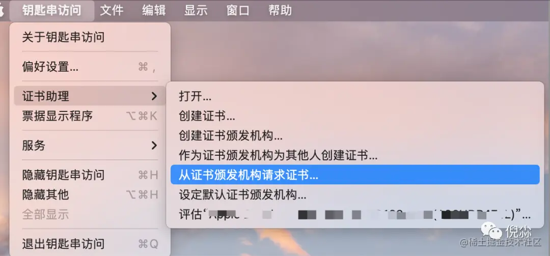 首先通过“钥匙串” 菜单栏选择【从证书颁发机构请求证书】。