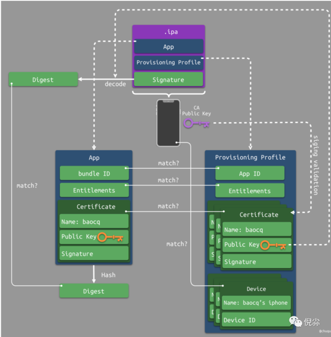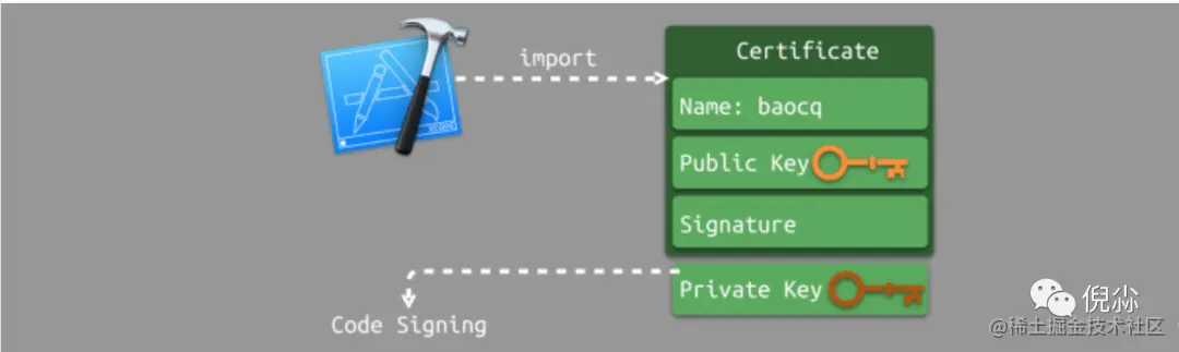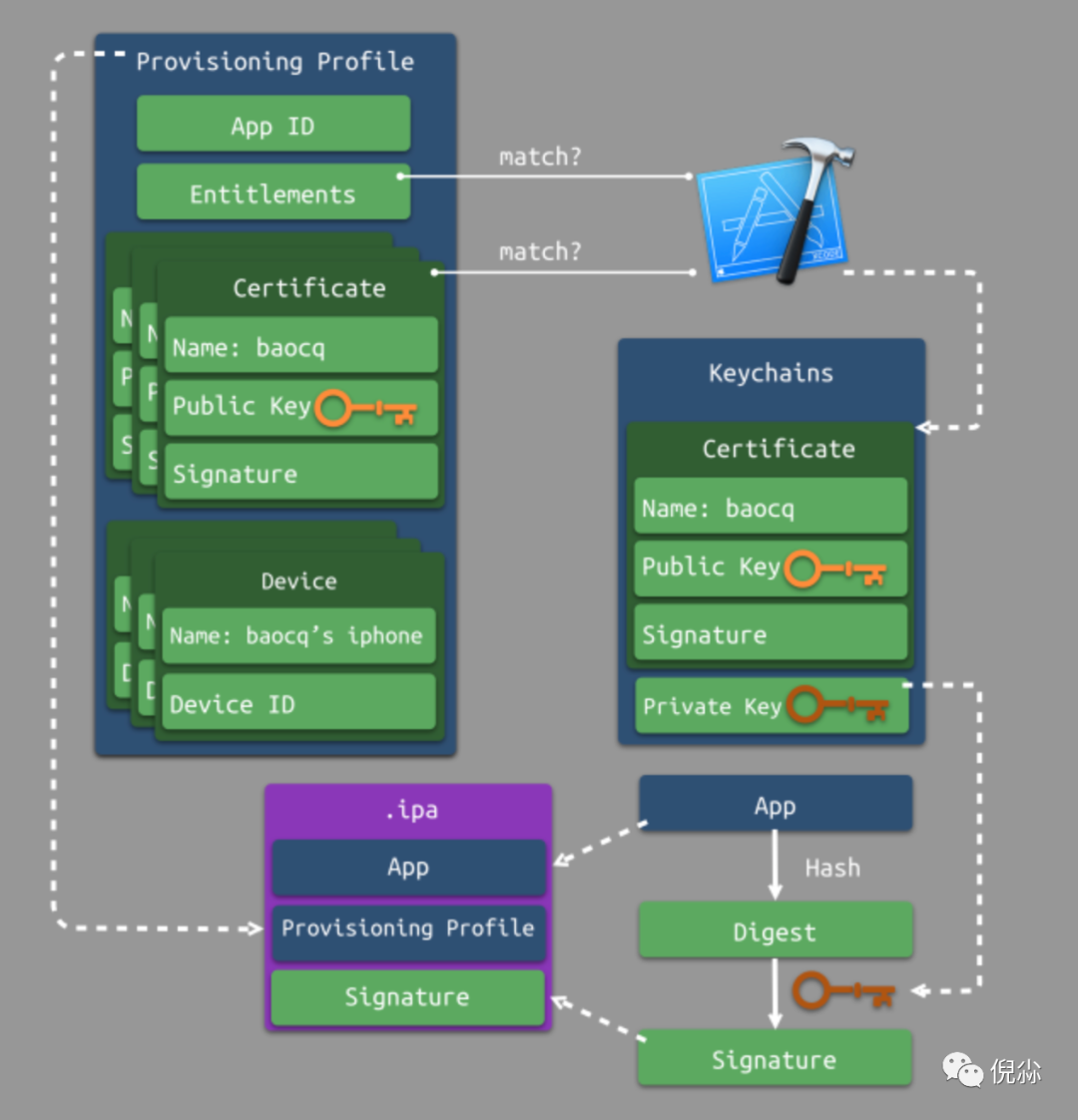 iOS证书包含开发者的信息以及开发者的公钥。Xcode 导入证书后,对App打包时,Xcode 会根据证书从keychain 中找到与之匹配的私钥,并使用私钥对App进行签名。当App 安装到真机时,真机使用开发者的公钥对App进行签名验证(App 中包含开发者公钥),从而确保来源的可信。