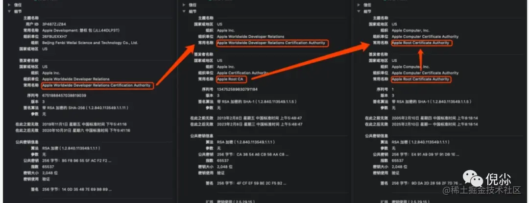 首先,我们来看一下 MacOS 系统中关于 iOS 开发证书的信任链示例(通过“钥匙串”查看):