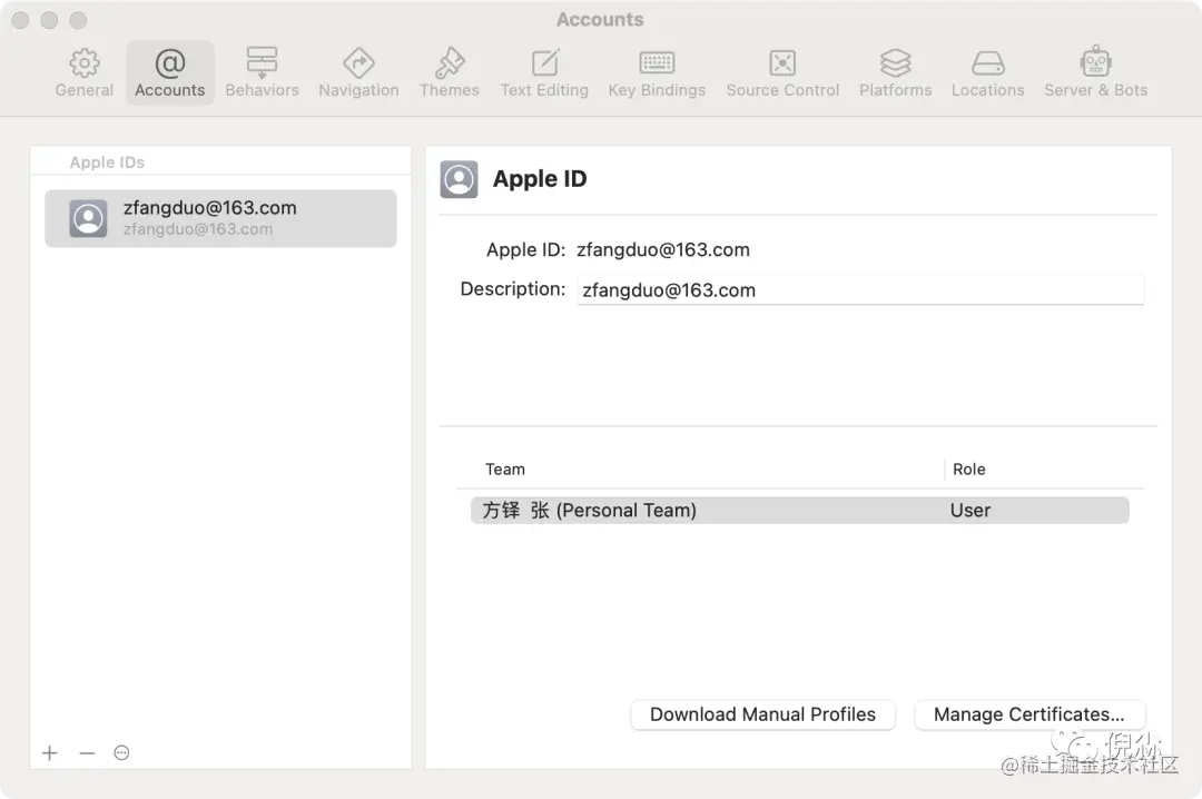 通过,Xcode 菜单【Preference…】->【Account】->【Apple IDs】->【+】,登录开发者账号。