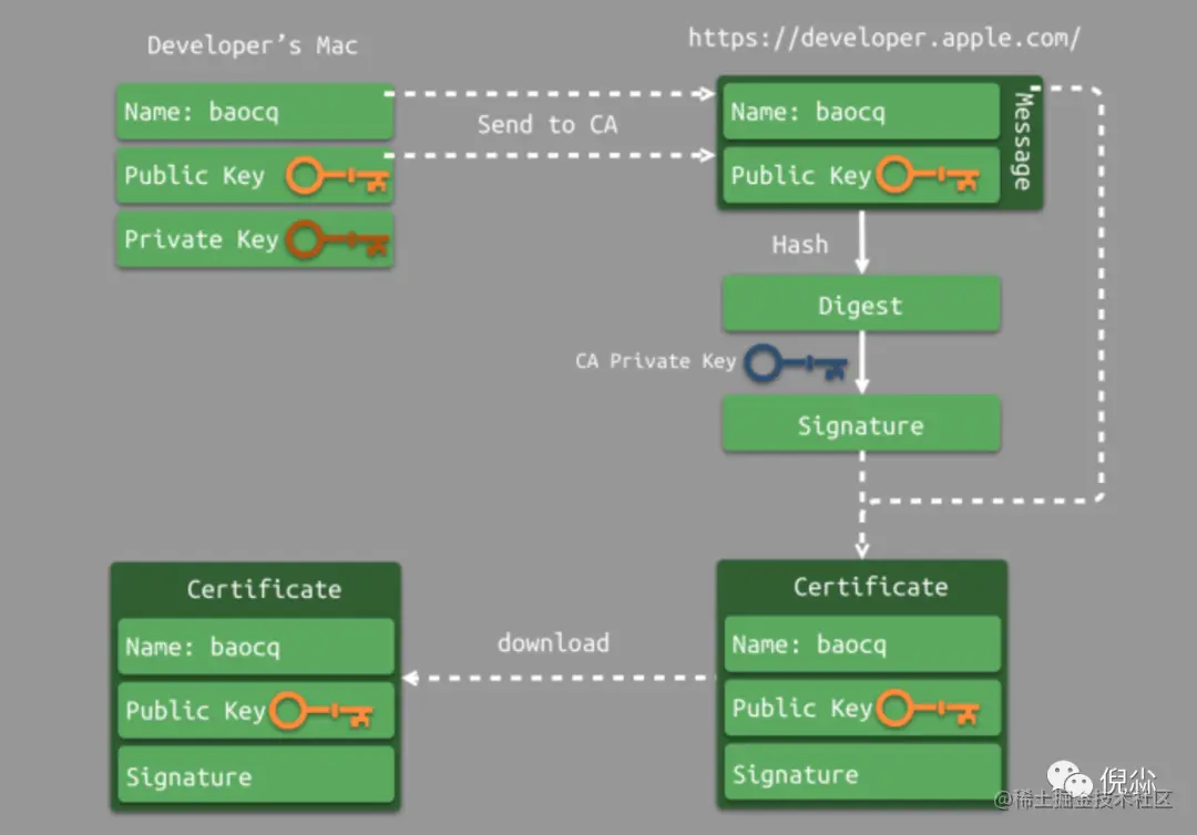 - CA 使用 CA 私钥对开发者的公钥、身份信息进行签名。