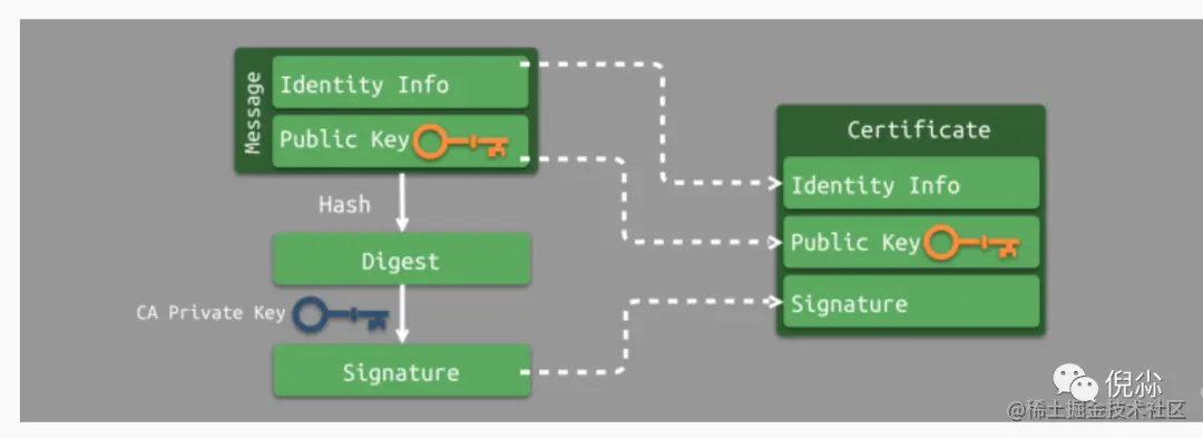 类似于身份证是有权威的公安局颁发的,公钥证书也是由权威的认证机构(Certificate Authority,简称CA)颁发的。认证机构向接收方提供发送方的身份信息和公钥。为了防止证书在颁发过程中被篡改,认证机构会将身份信息和公钥作为消息,用CA私钥 进行签名,进而将身份信息、公钥、签名一起放入证书,过程如下所示: