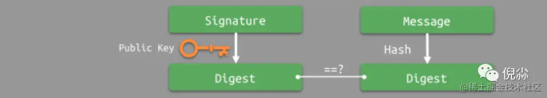 签名验证由通信中的接收方进行,过程如下图所示。一般来说,发送方会把消息、签名一起发送给接收方。接收方首先使用发送方的公钥对签名进行解密,计算得出一个摘要。然后使用消息进行哈希,计算得出另一个摘要。最后,判断两个摘要是否相等,如果相等则说明接收到的消息没有被第三方进行篡改。